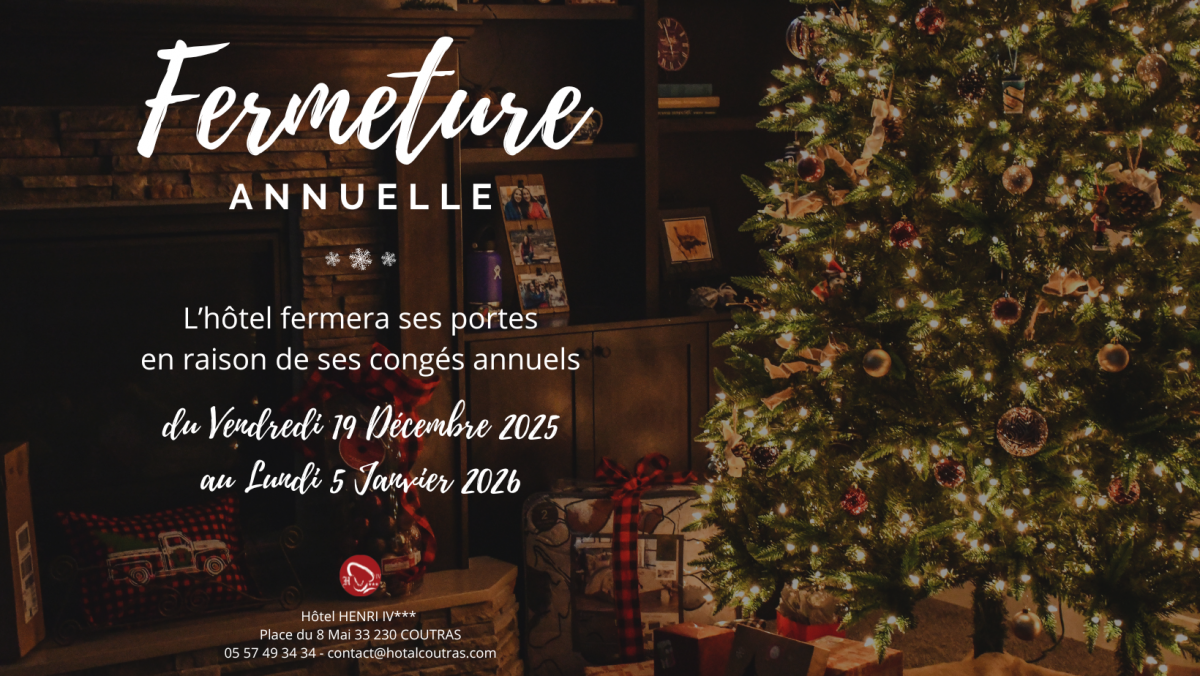 En raison des congés annuels de fin d'année, l'Hôtel sera fermé du Vendredi 19 Décembre 2025 au Lundi 5 Janvier 2026.